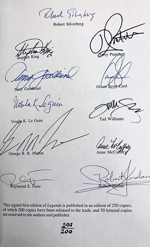 • Slipcased Lettered Edition of 50 copies signed by all contributors including SK. These were given as presentation copies the contributors and not sold to the public. Where possible the letters given matched the recipient's name - For example, Stephen King received copy "K" Terry Goodkind received copy "G" etc. Issue Price = N/A