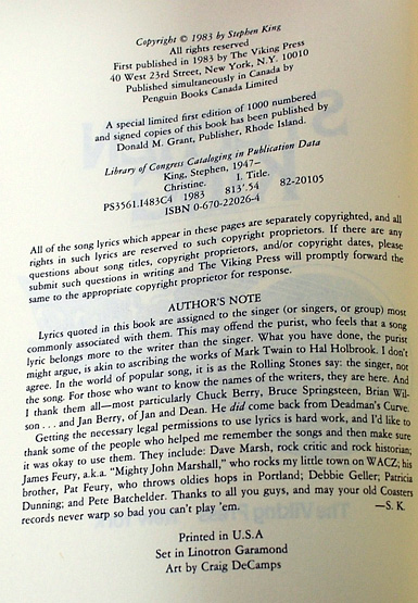 A first edition of 270,000 copies. Issued with a dustjacket and price of $16.95. As with many early viking editions, this book can be hard to authenticate as a true 1st edition. Look at the tips below to help identify a 1st edition Christine. Current Value = $25-$100 (highly dependent on condition)