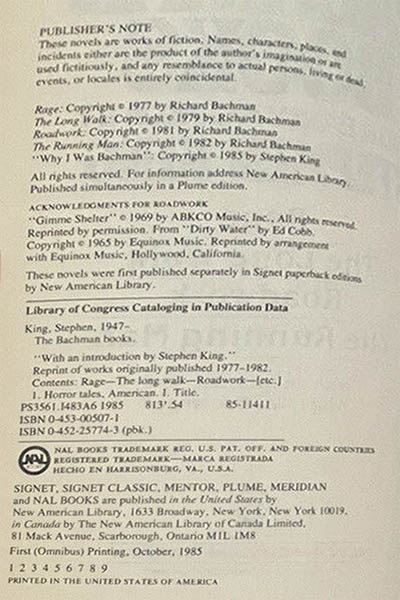 This book ins an omnibus edition containing four of the six books that King published under his Richard Bachman pseudonym: Rage, The Long Walk, Roadwork, and The Running Man.(The missing titles being Thinner and The Regulators) In 1999 King had Rage taken out of print and the three other novels in this omnibus were re-released seperatly.