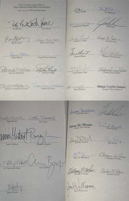 - Limited edition of 345 copies. Signed by 39 contributors except Joseph Payne Brennan (deceased). Bound in English pigskin and German linen with Japanese hand marbled endpapers housed in a leather-bound traycase. Issue Price = $160