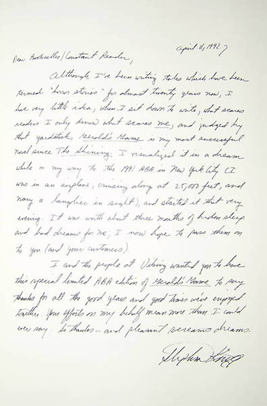 - Advanced Reading Copy: Estimated to be 5,000 copies or less these were given away for free at the American Booksellers Association Convention convention in 1992 with a cardboard slipcase. THe endpaper features a letter with facsimilie SK signature. Issue Price = FREE
