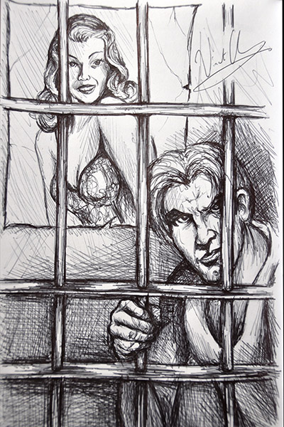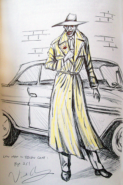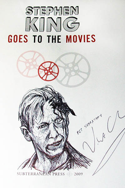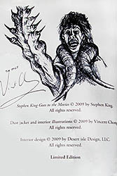 All five remarques posted here are done in limited edition copies of Stephen King Goes to the movies. The first 4 are inspired by the movie posters Vincent did. The fifth, of the “Low Man”, was drawn from the story itself (the relevant page is referenced by Vincent in the drawing).