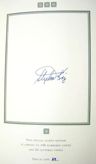 - Limited edition bound in leather and cloth, with matching slipcase was issued in a print-run of 148 signed and numbered copies. These copies were signed by Stephen King and printed on #70 Mohawk superfine paper. Original price was $900. Currently $2,750 - $3,500