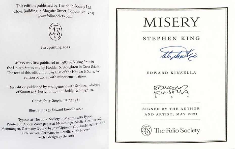 - A single edition of approximatly 2,500 copies, housed in a slipcase - 100 of these came with a bookplate signed by Stephen King and Edward Kinsella. Issue price $89.95 (unsigned) $225 (signed)